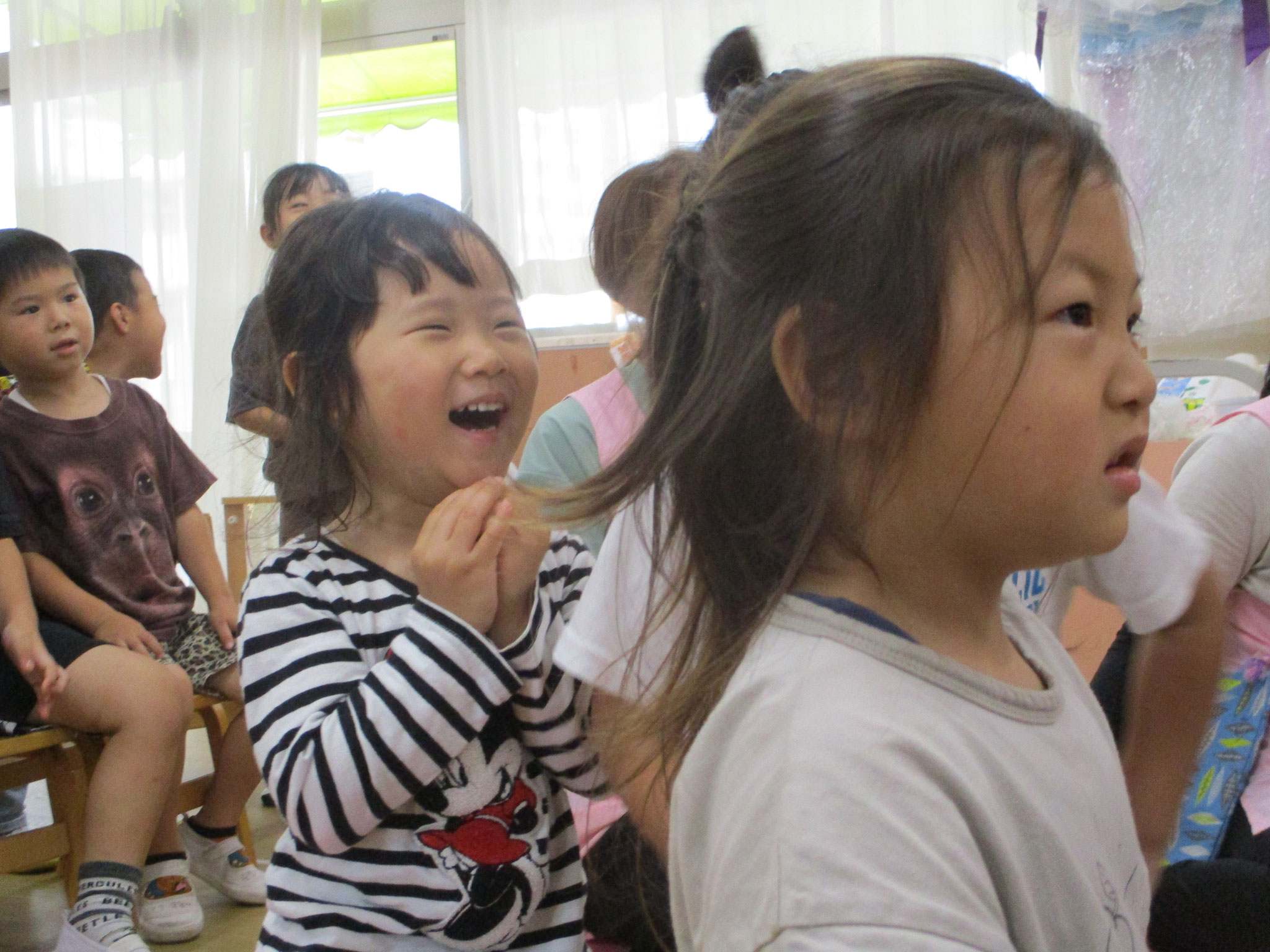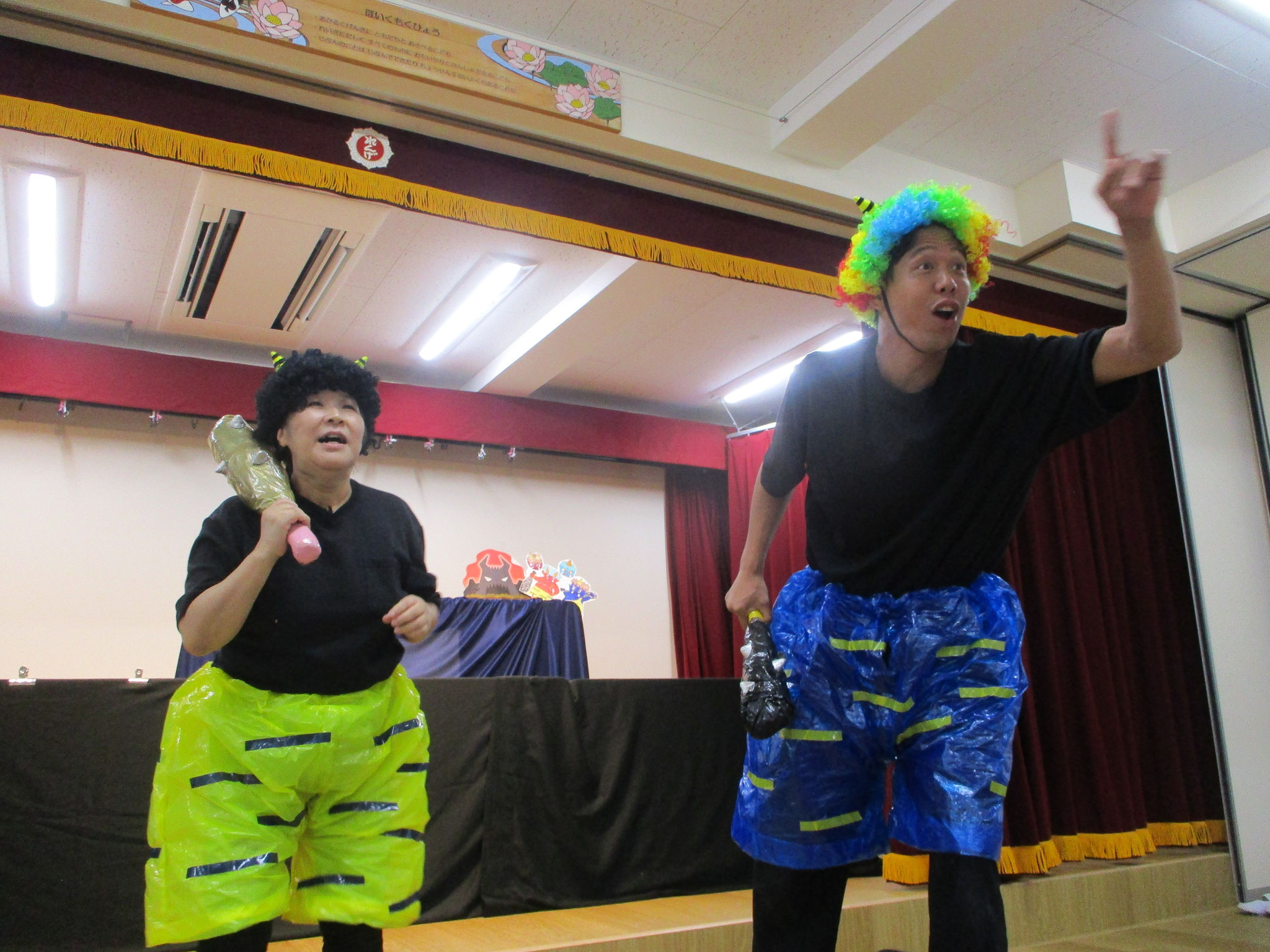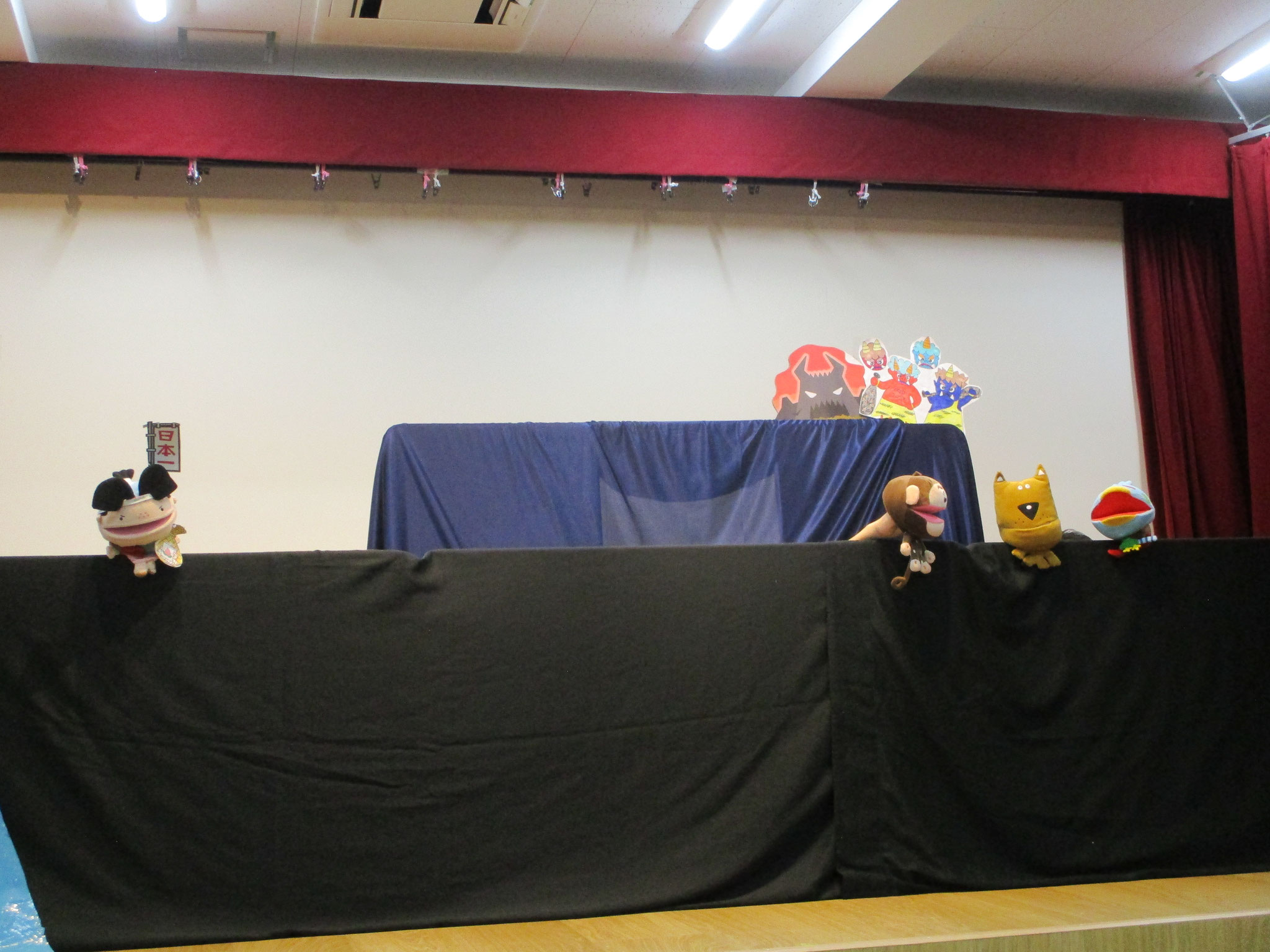 待ちに待った9月生まれの誕生会です。「おめでとう」とみんなからお祝いをしてもらい絵本のプレゼントを大切そうに抱きしめていた子ども達でした。先生からの出し物は、人形劇「ももたろう」。可愛い人形が登場すると嬉しそうに見ていた中で、実写の鬼が登場し乳児クラスの子ども達はビックリ!!だけど幼児クラスのお兄さんお姉さんは「〇〇先生だ」と大笑い。その声を聞いて乳児クラスの子ども達も自然とニコニコになり、最後まで楽しんで過ごしていました。